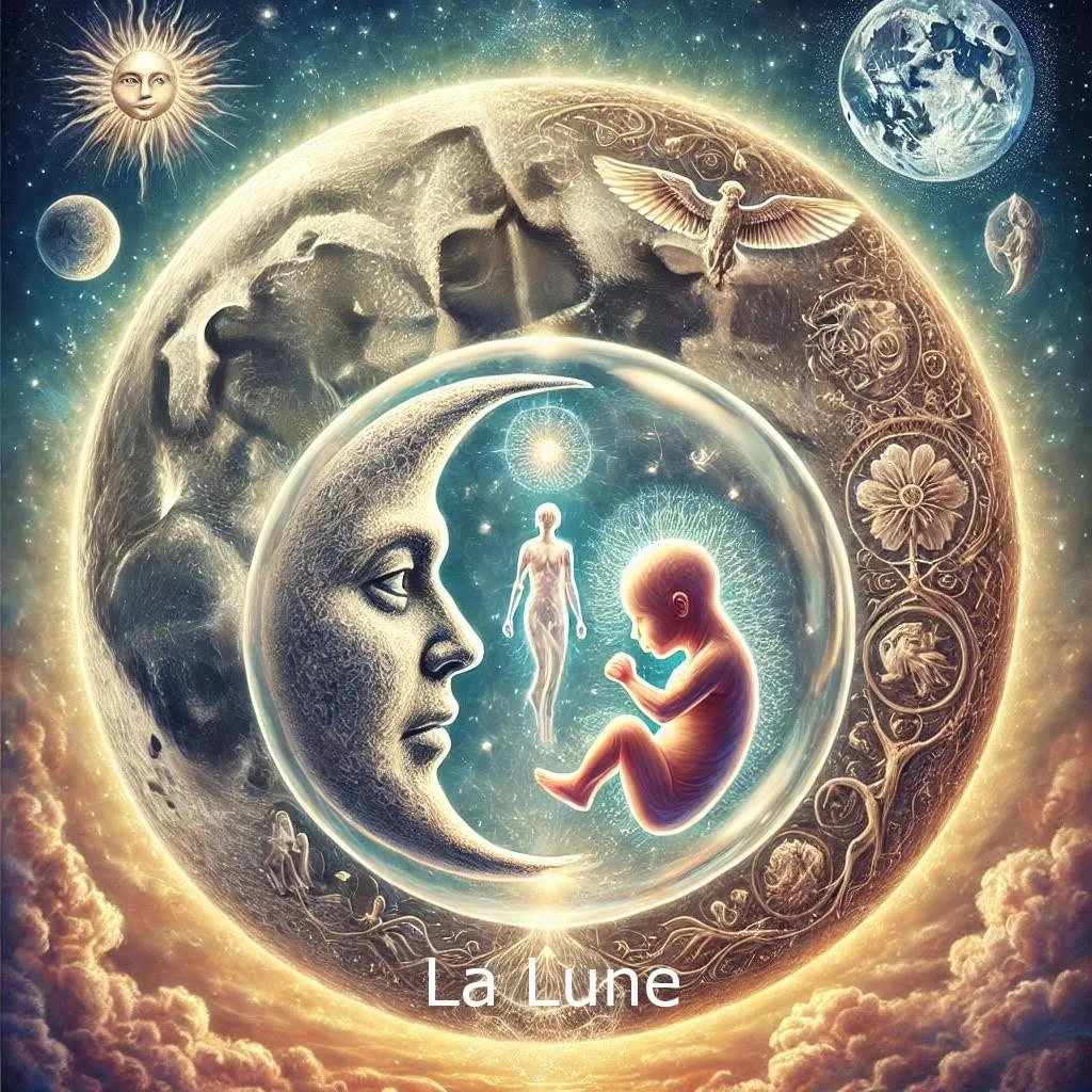 La Lune représente une partie de la totalité de la lumière provenant du Soleil que nous pouvons assimiler. Nous ne pouvons pas accueillir toute la lumière, cela nous détruirait. Mais la portion de lumière représentée par la Lune est celle que nous pouvons transformer en forme vivante, celle que nous pouvons infuser dans la matière. La Lune représente le conteneur dans lequel se déroule la formation du corps physique, c'est-à-dire l'utérus et aussi le conteneur dans lequel se développe l'individualité, c'est-à-dire l'ego conscient.
